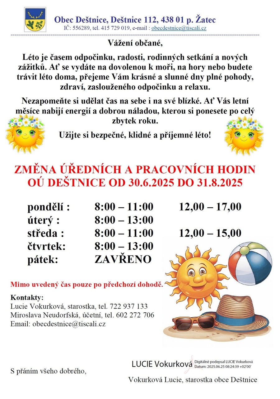 Úvod > Aktuality > Úprava úředních a pracovních hodin OÚ Deštnice v letních měsících