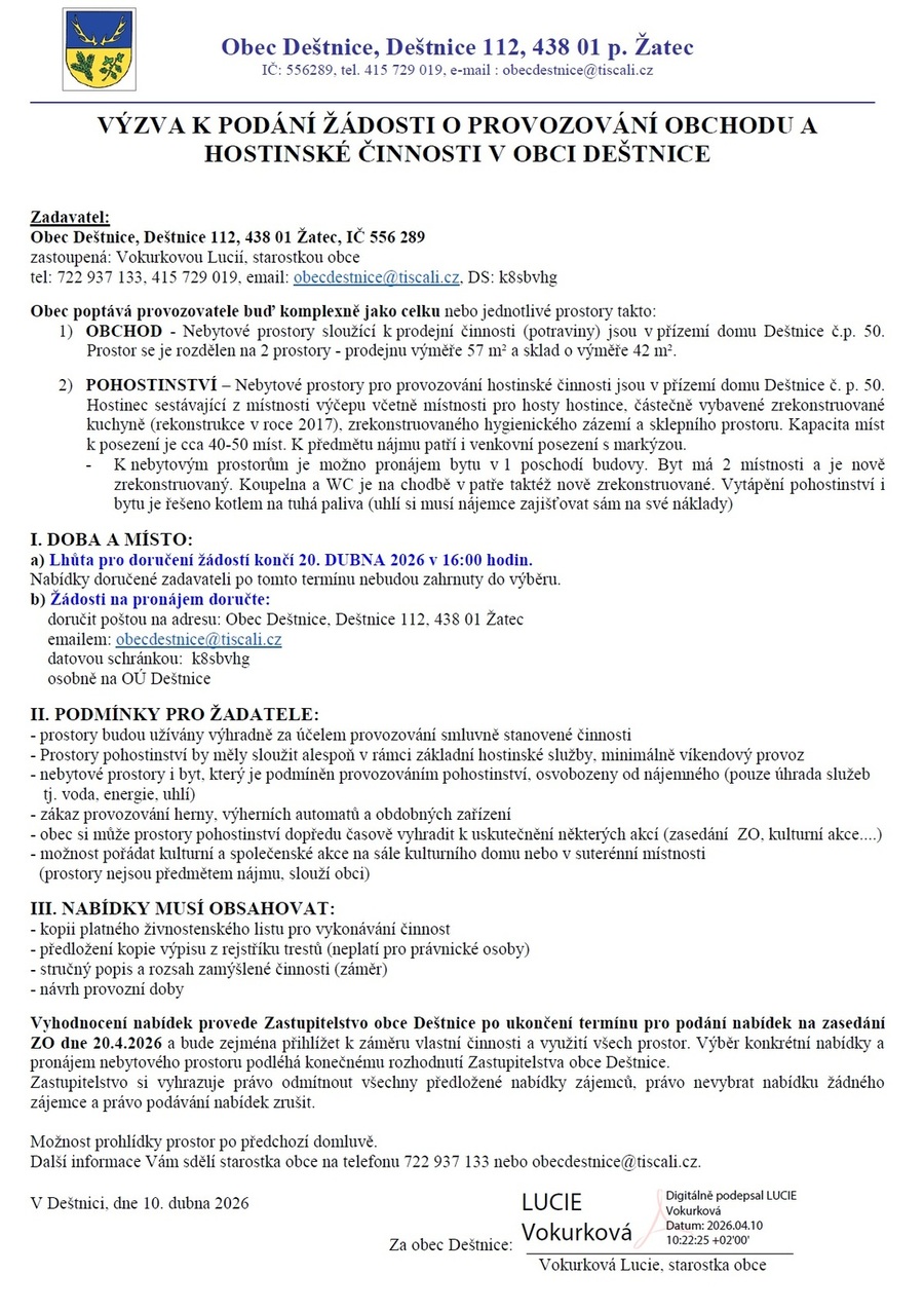 Úvod > Aktuality > VÝZVA K PODÁNÍ ŽÁDOSTI O PROVOZOVÁNÍ OBCHODU A HOSTINSKÉ ČINNOSTI V OBCI DEŠTNICE