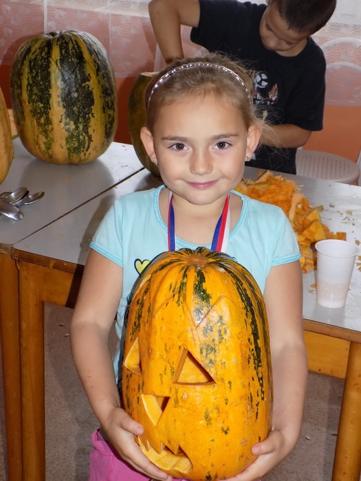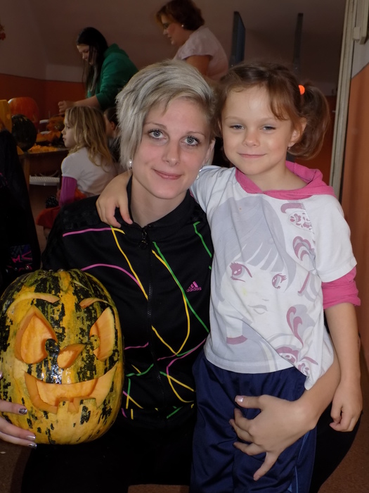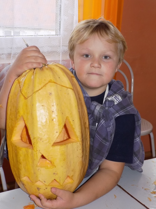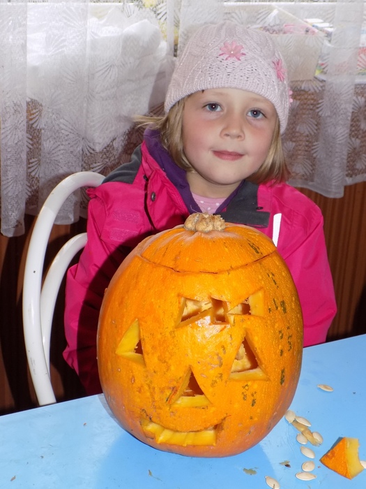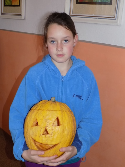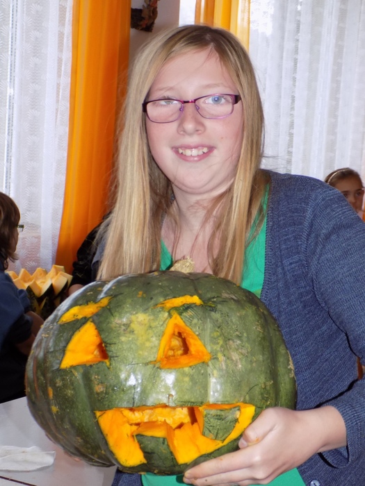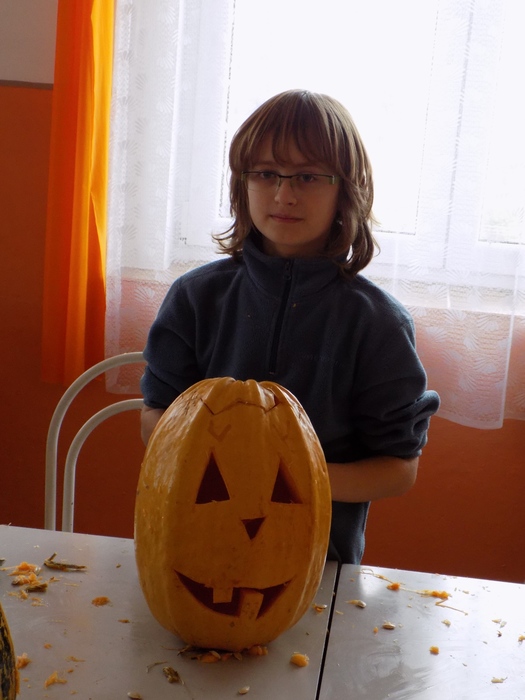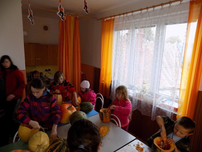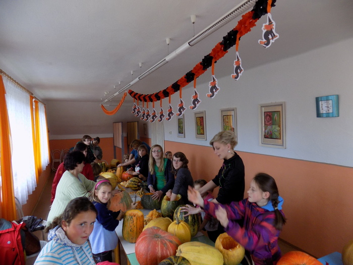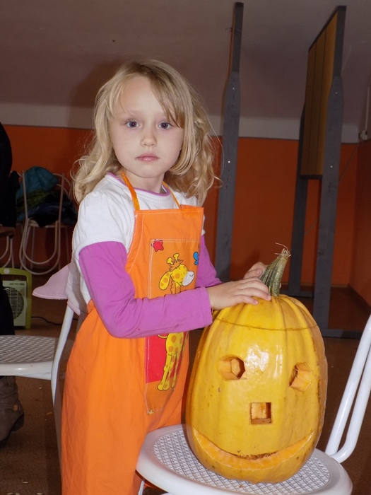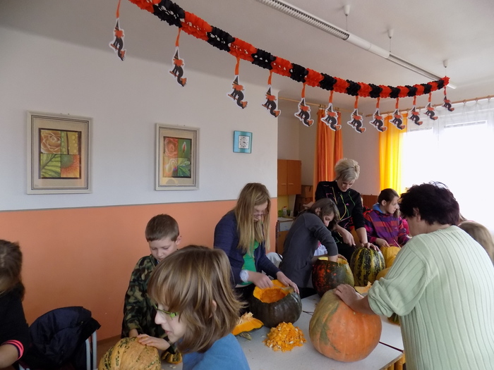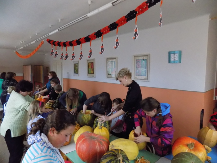 V úterý 28.10.2014 proběhlo v malé zasedací místnosti nad obchodem dlabání dýní. Pro každého byla připravena dýně, ze které si sami vydlabali "strašáka", kterého si v sobotu společně všichni vystaví a rozsvítí. Celkem se zúčastnilo 24 dětí a 7 dospělých.